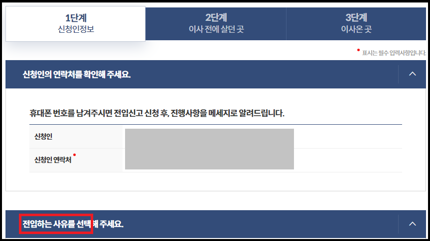 전입신고하기를 누르면 신청인의 정보가 자동으로 나오고 전입하는 사유에 체크만 하고 다음단계를 눌러줍니다.
