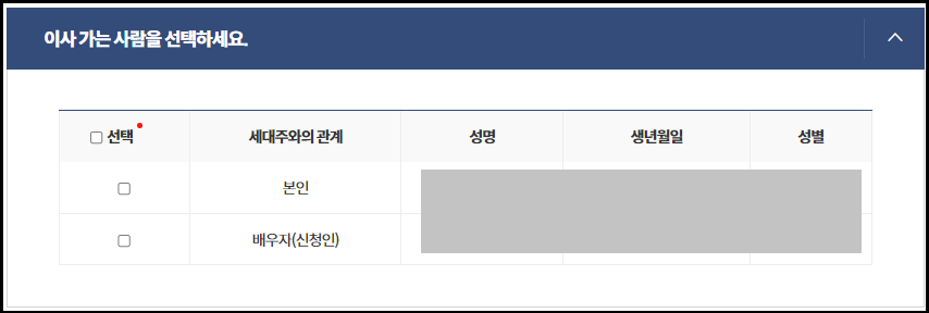 이사 갈 사람인 본인을 체크하고 다음 단계로 갑니다.