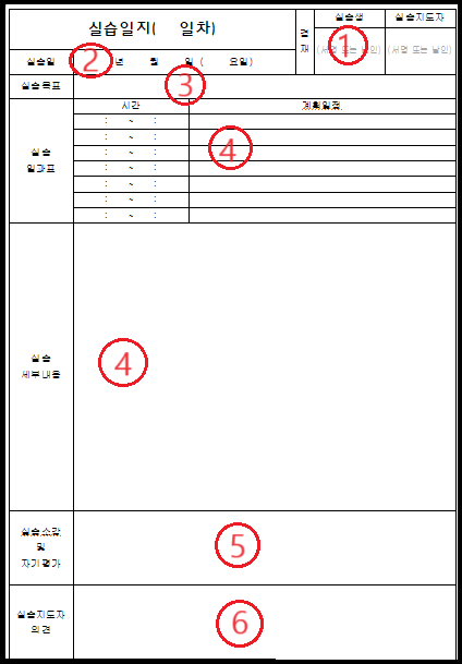 실습일지에는 ①실습생명, ②실습일, ③오늘의 목표, ④진행내용(시간, 내용 등을 중심으로 기록), ⑤실습생 의견(배운 점, 의문사항, 건의 등 포함), ⑥실습지도자 의견이 필수로 들어가야 합니다.