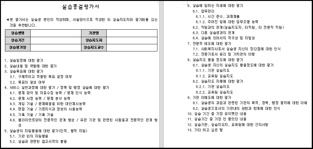 사회복지 실습이 끝나갈 무렵 또 하나의 평가서를 작성하게 됩니다. 바로 실습 종결 평가서입니다. 혹은 실습 최종 평가서라고 하기도 합니다. 종결 평가서는 중간 평가서에 비해 질문이 다양하고 분량이 많기 때문에 어쩌면 어려울 수도 있는데요. 재가노인지원서비스센터를 예시로 하나하나 짚어보면서 예문으로 작성해 보겠습니다.