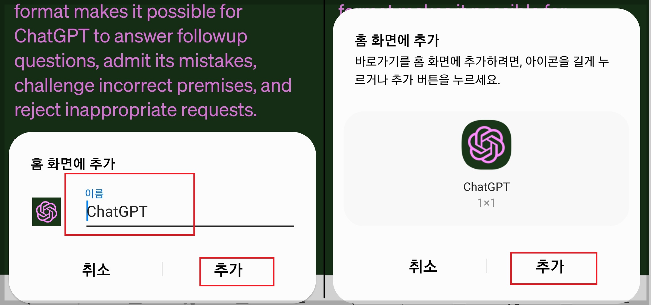 아이폰의 기능 중에 홈화면 추가 기능이 있습니다. 삼성 갤럭시에도 일반 사이트를 홈화면에 추가해서 앱처럼 사용할 수가 있는데요. chat gpt를 홈화면에 추가해서 앱처럼 사용할 수 있게 설치해 보겠습니다.