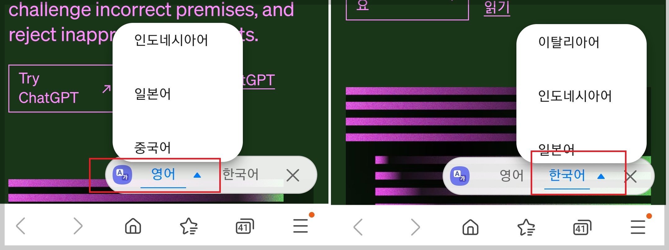 하단에 번역기가 표시되면서 영어와 한국어가 나옵니다. 이제 chat gpt를 한국어로 볼 수 있습니다.